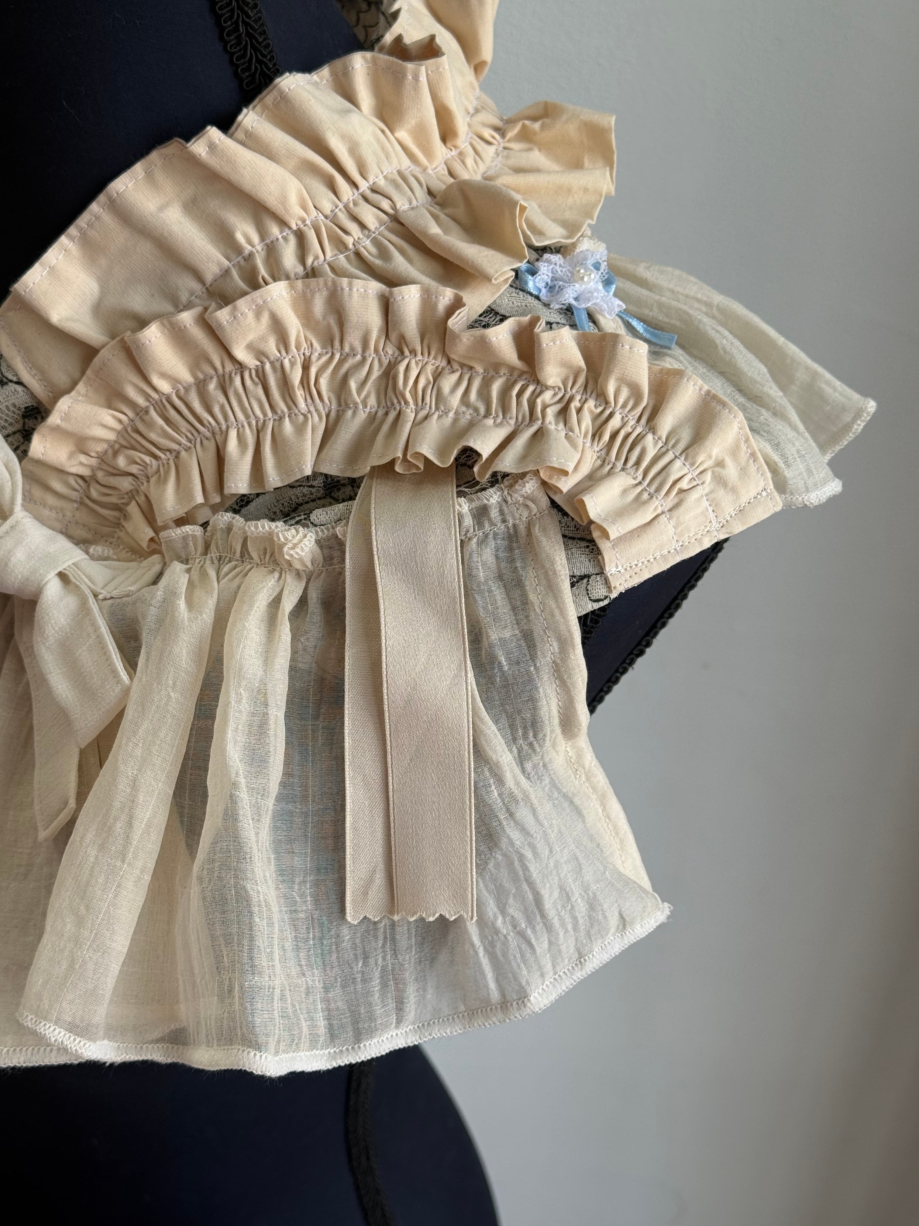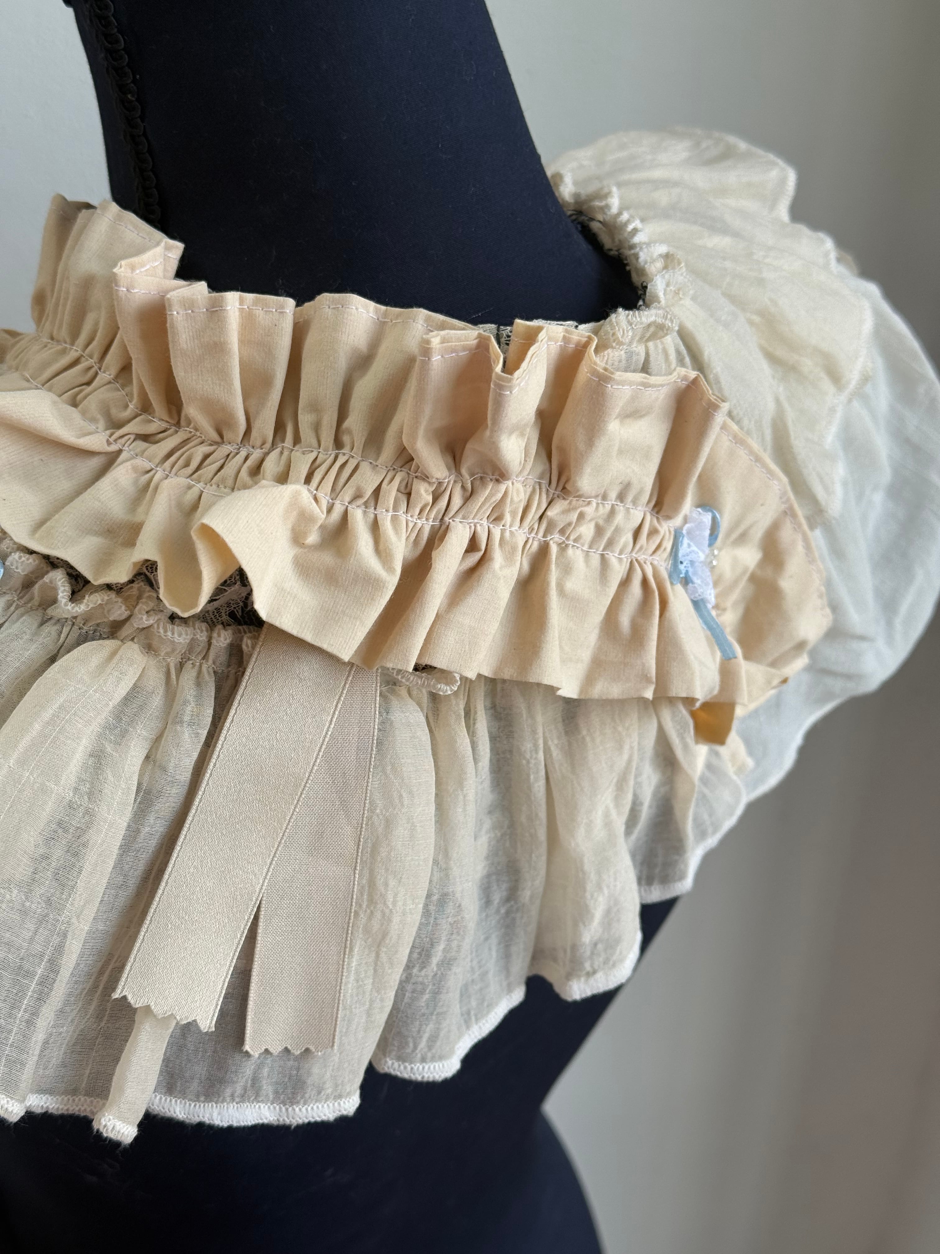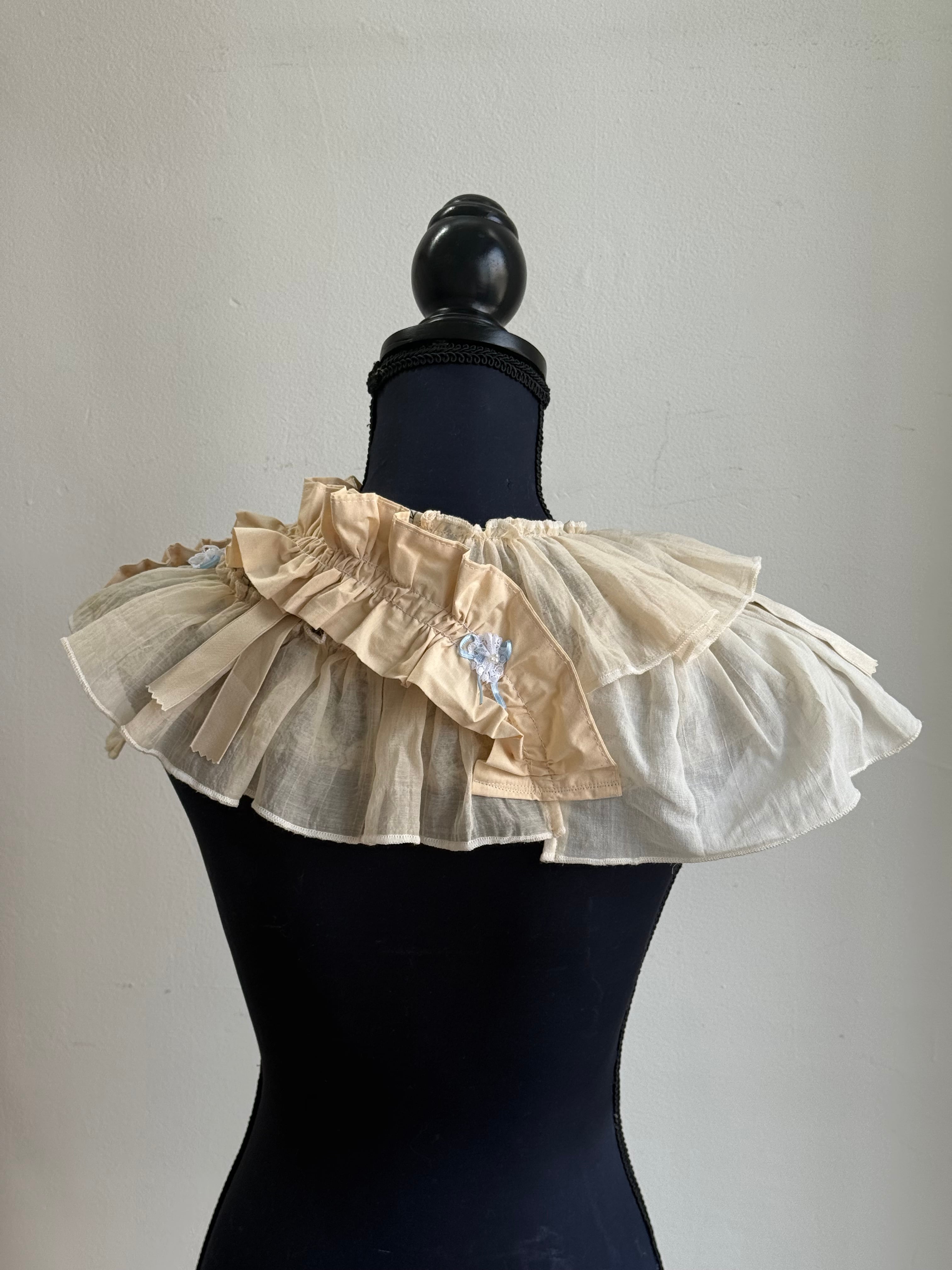 優しい色合いの生地のフリルが