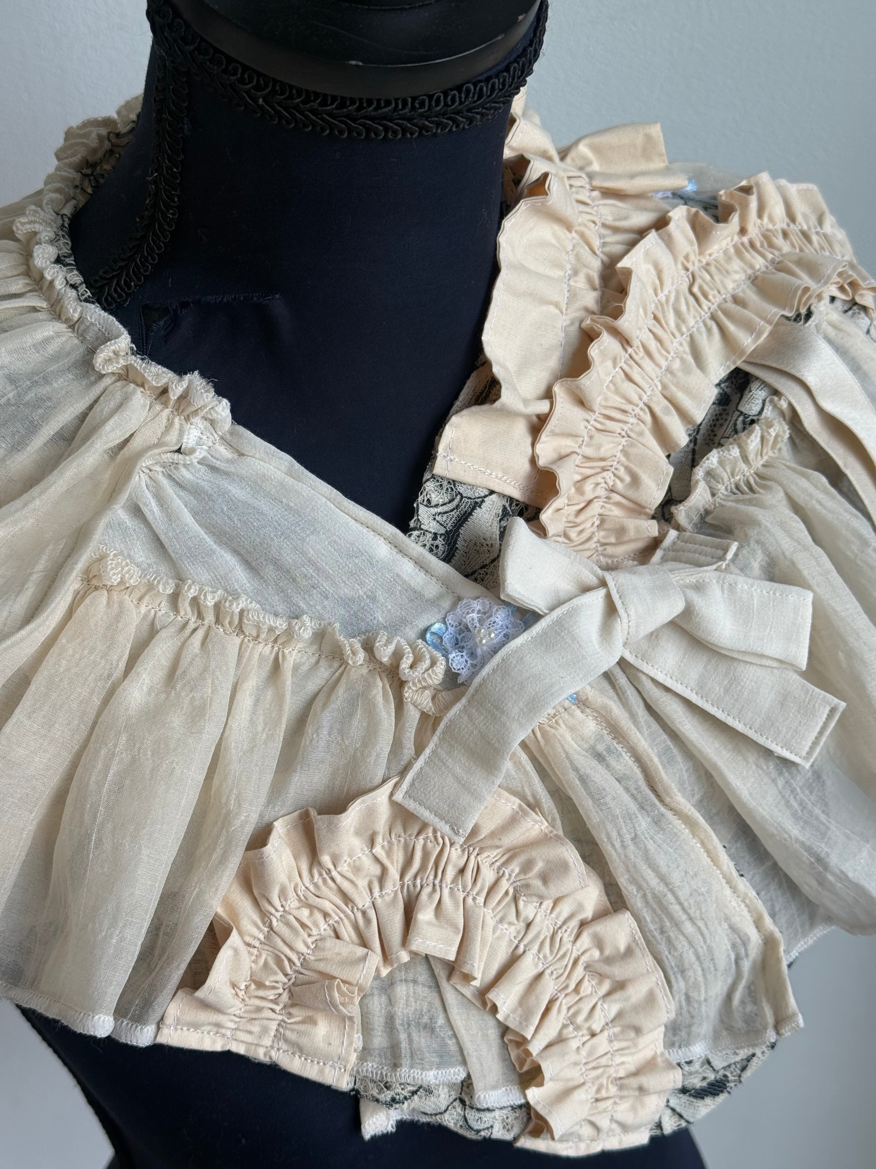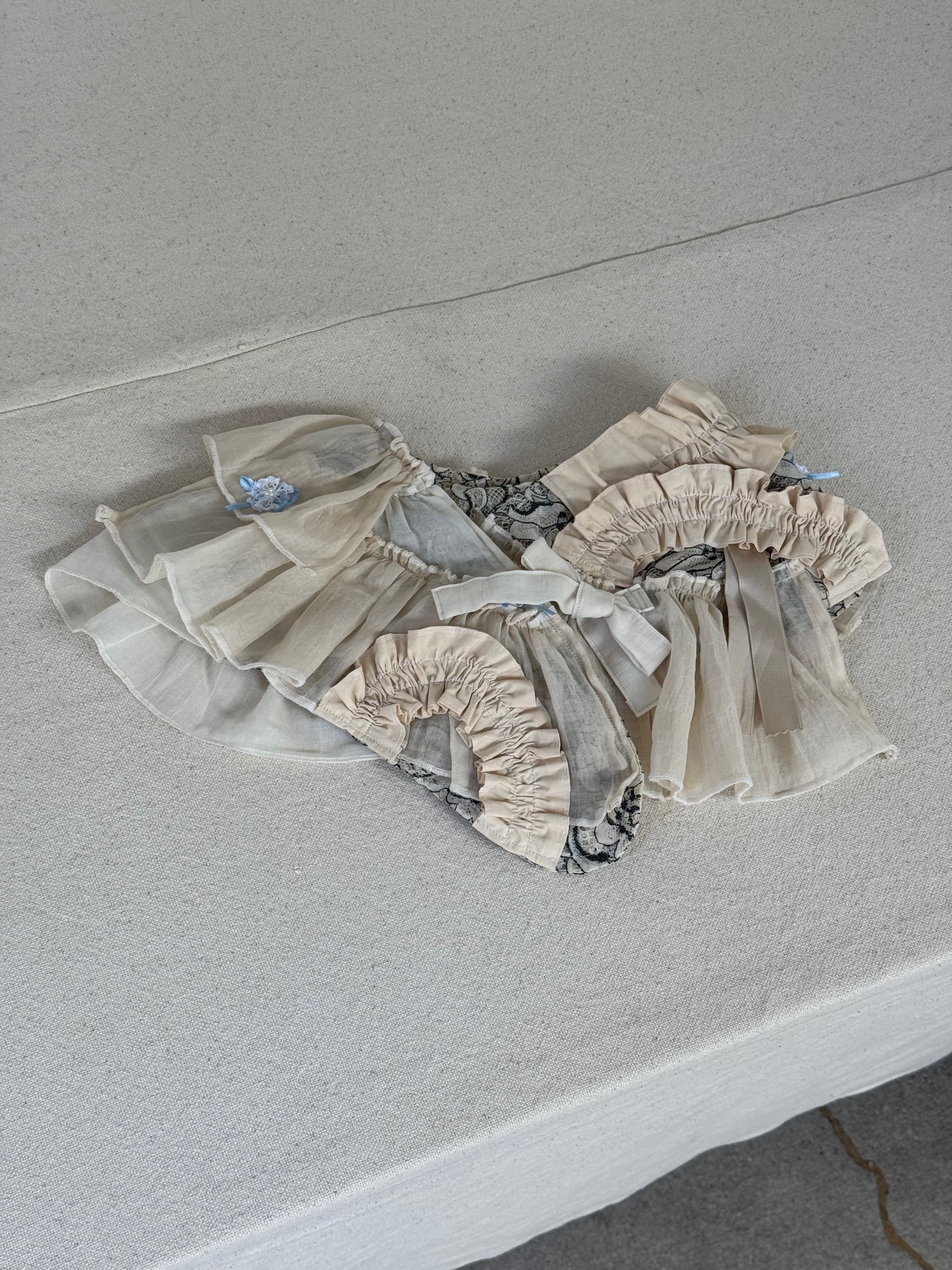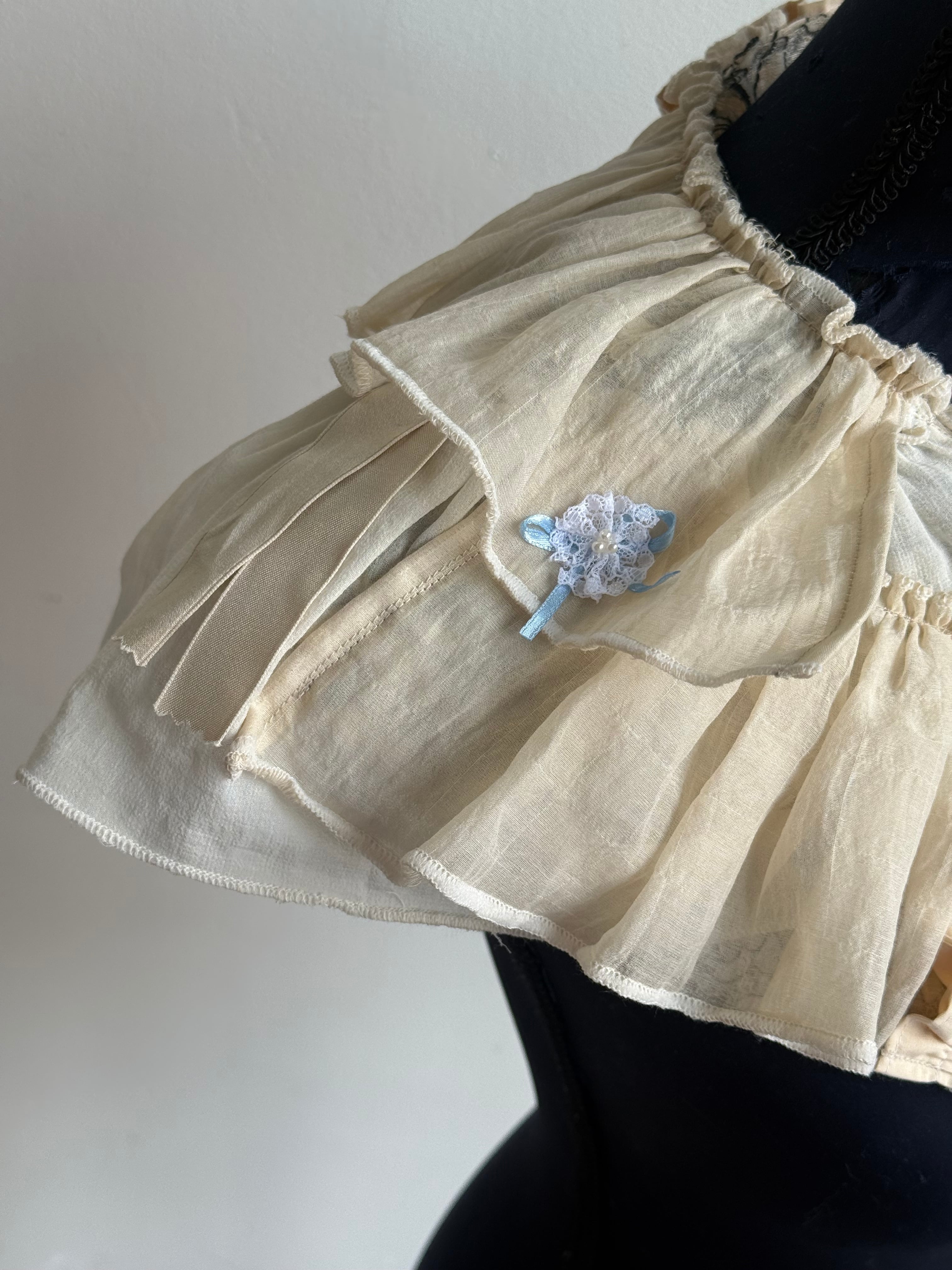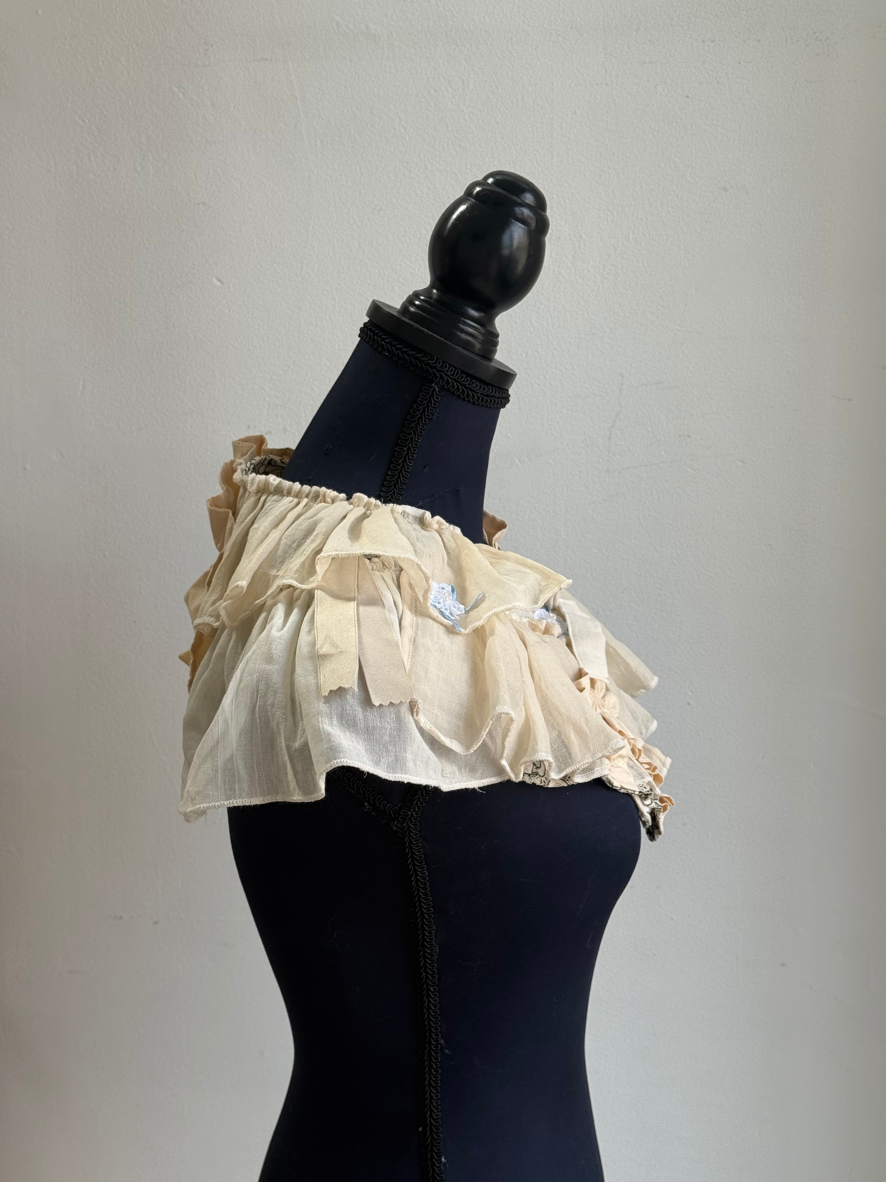 優しい色合いの生地のフリルが