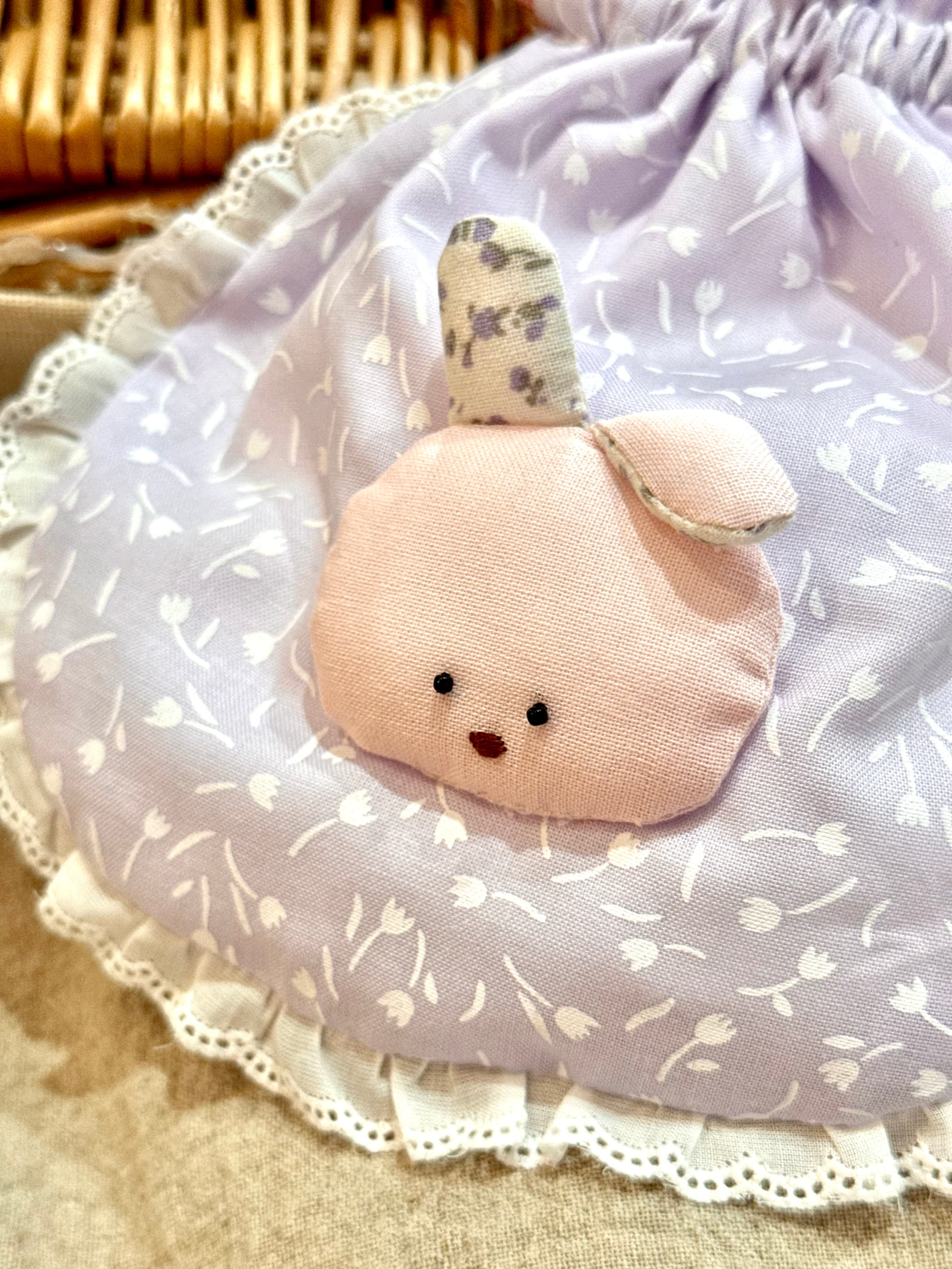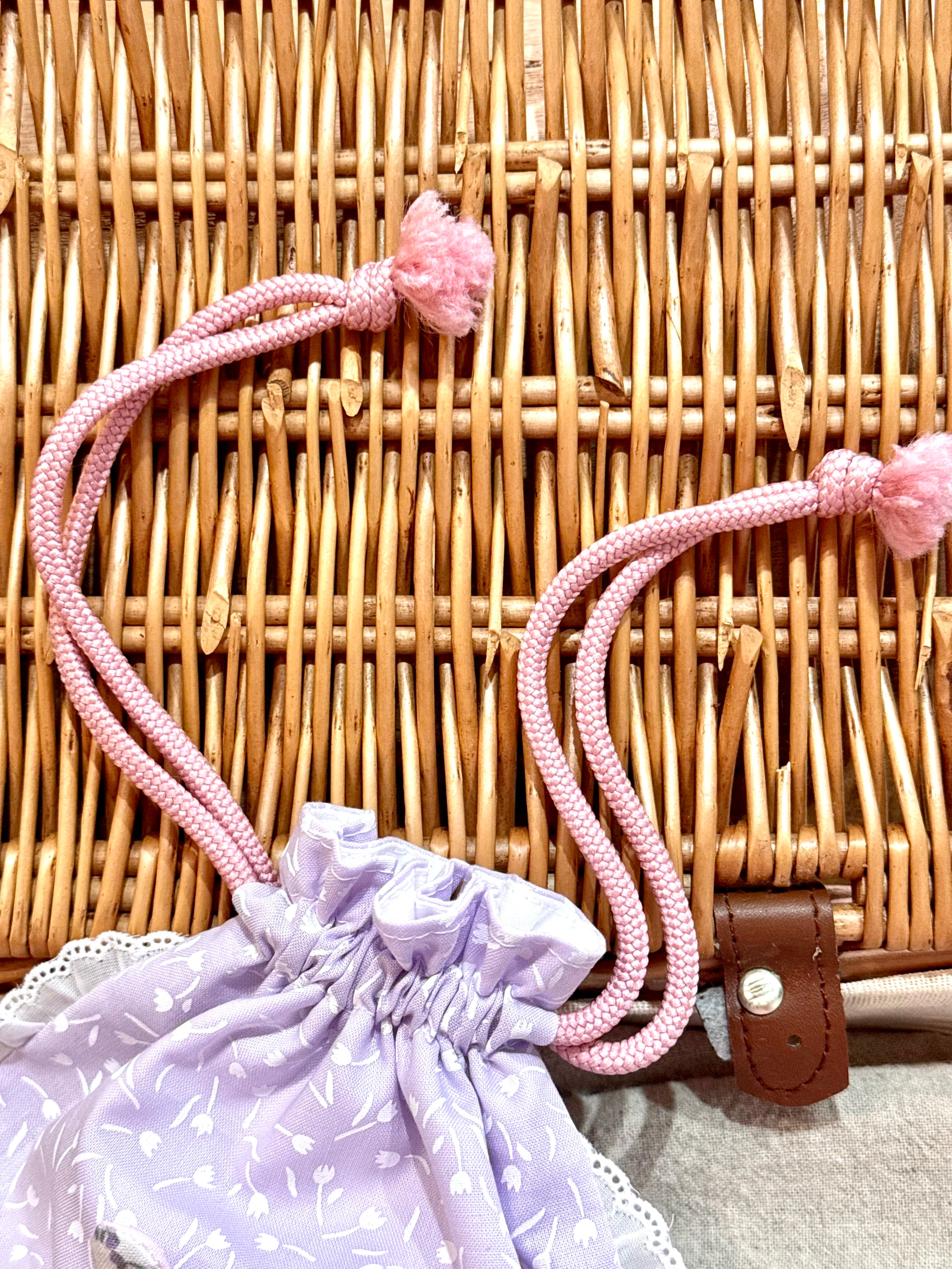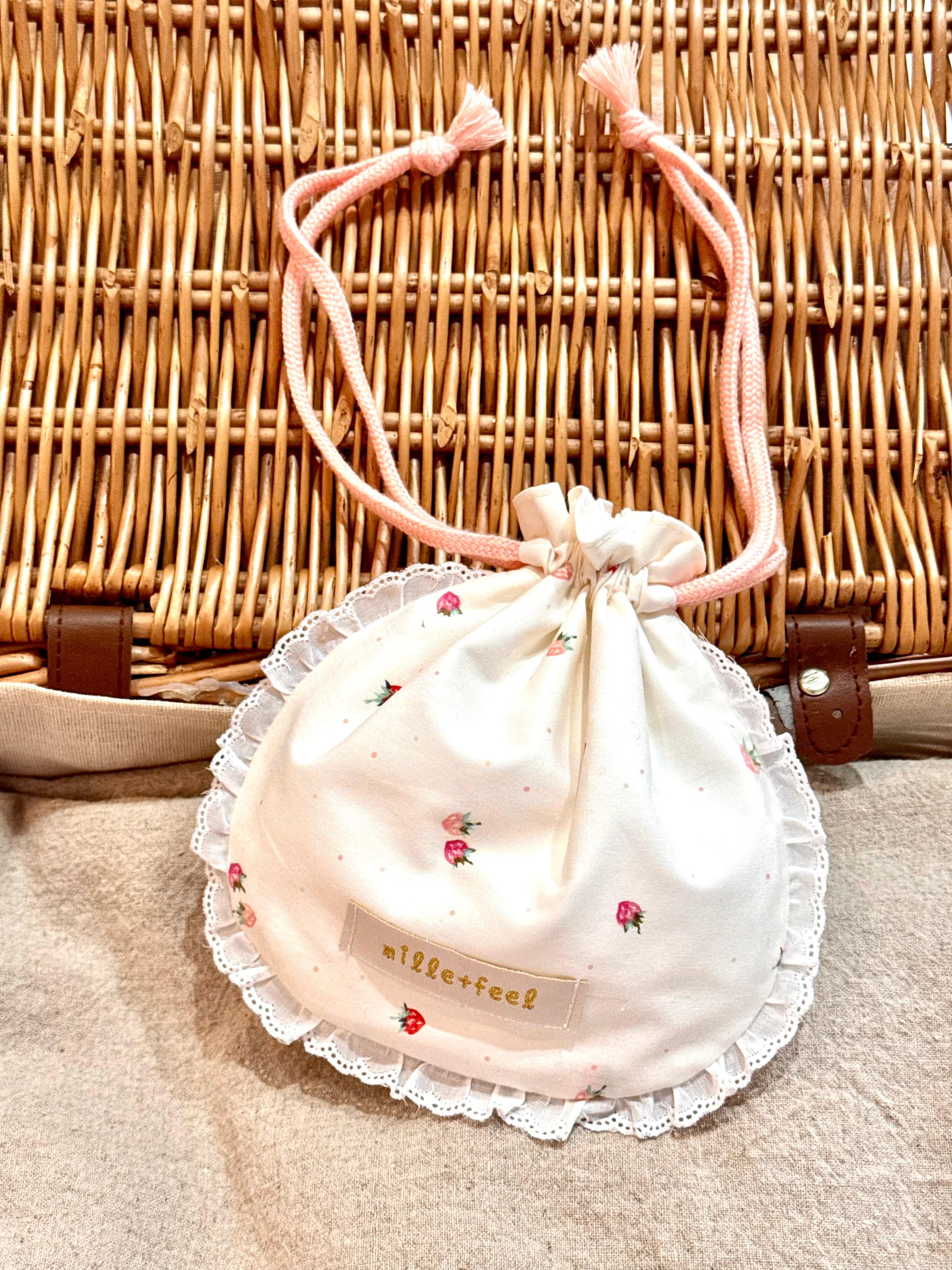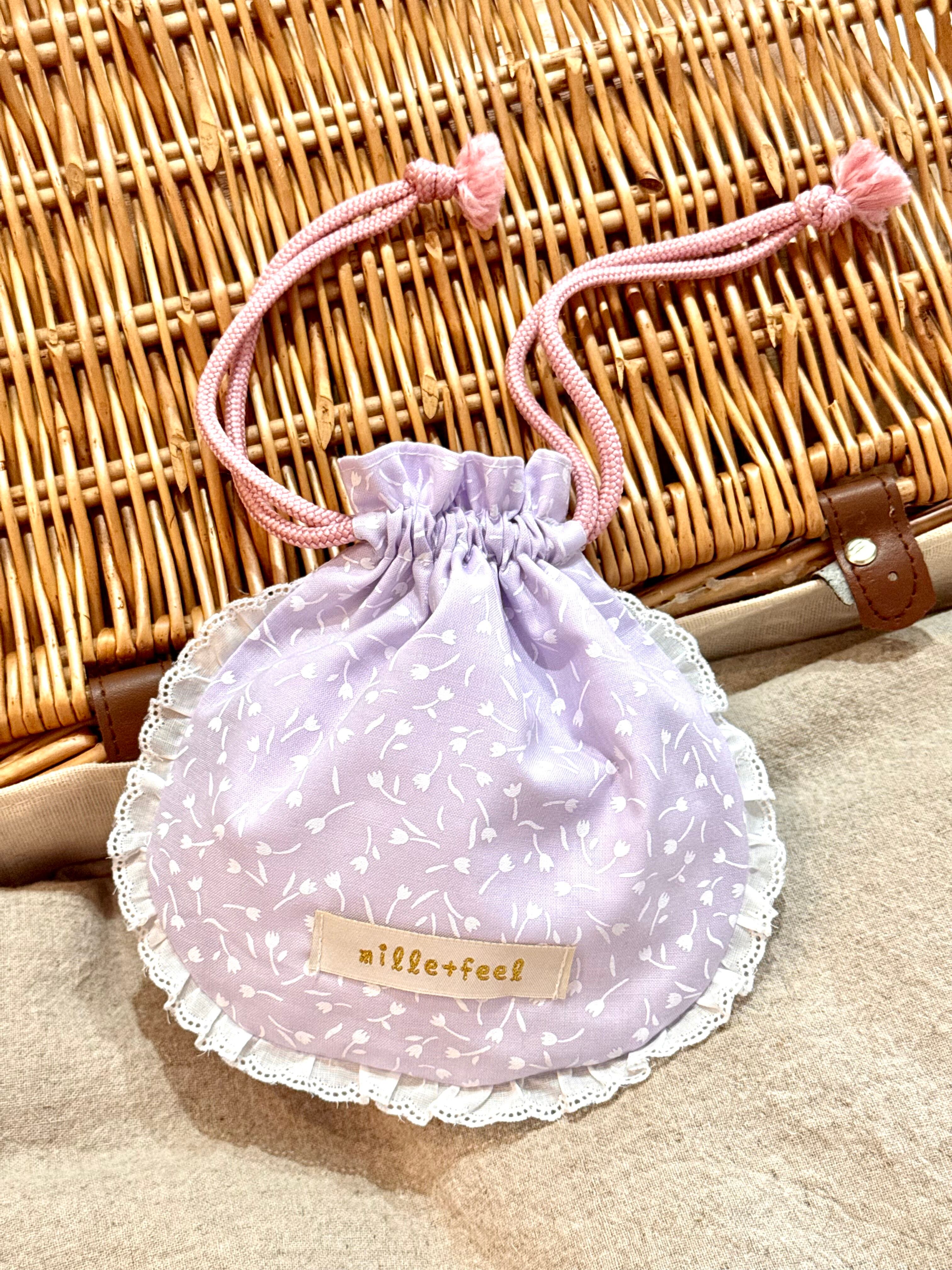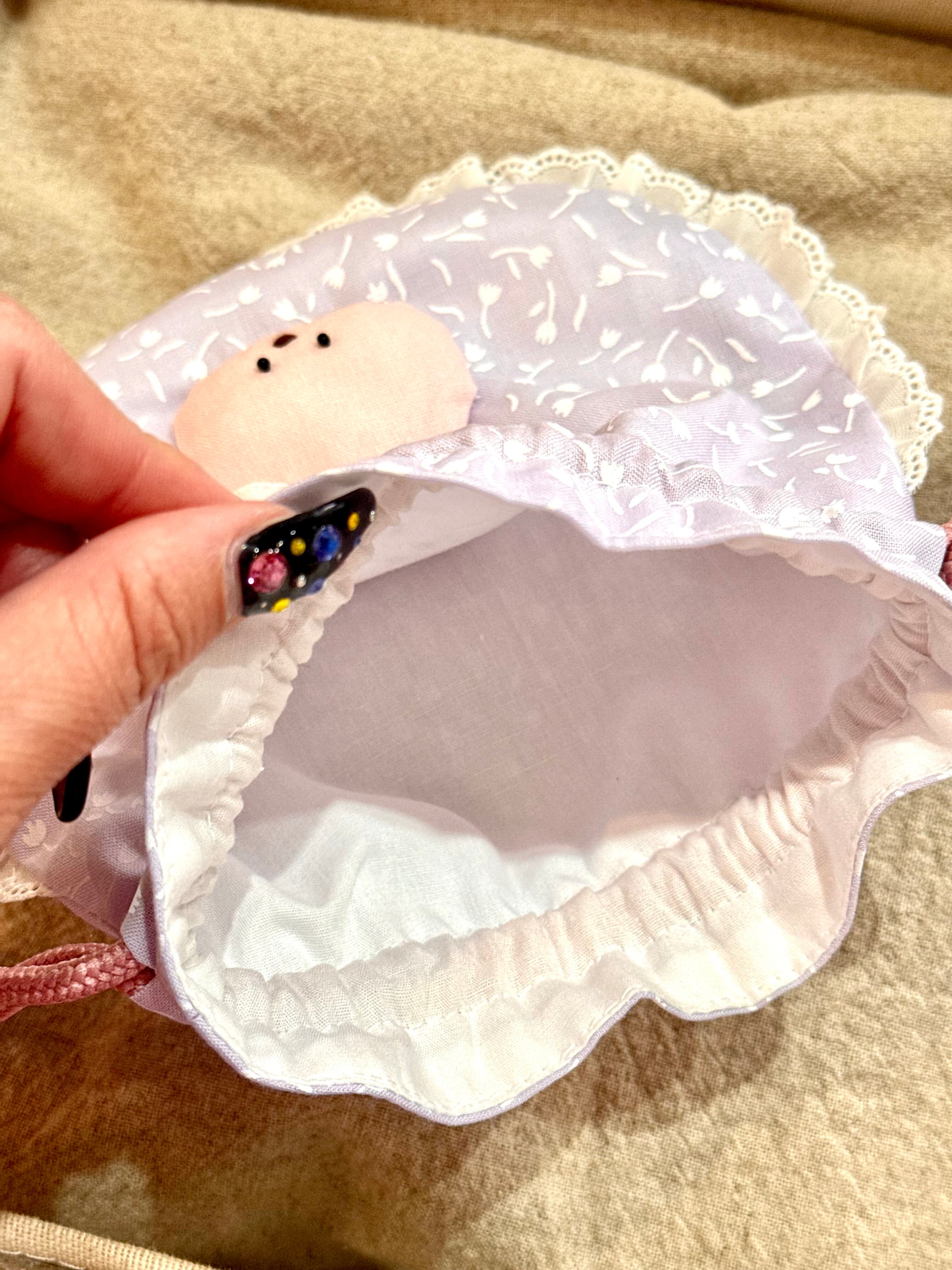 巾着自体の形がまぁるくてフリルで縁取られていて